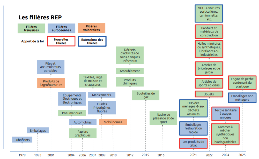 La France est l’un des pays qui utilisent le plus le principe de Responsabilité Élargie des Producteurs (REP) dans la structuration de ses filières de gestion des déchets. Actuellement, une quinzaine de filières REP existent.